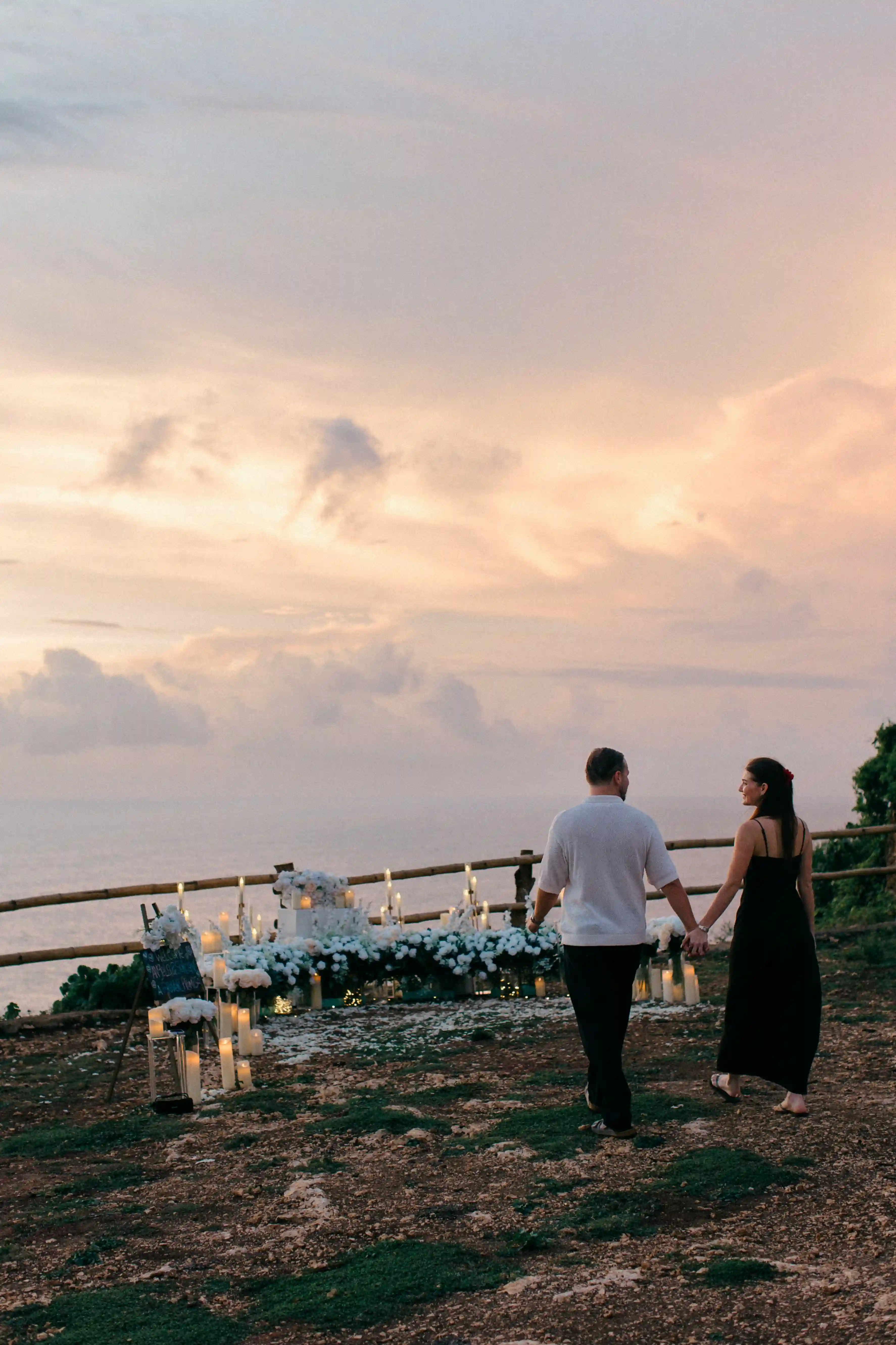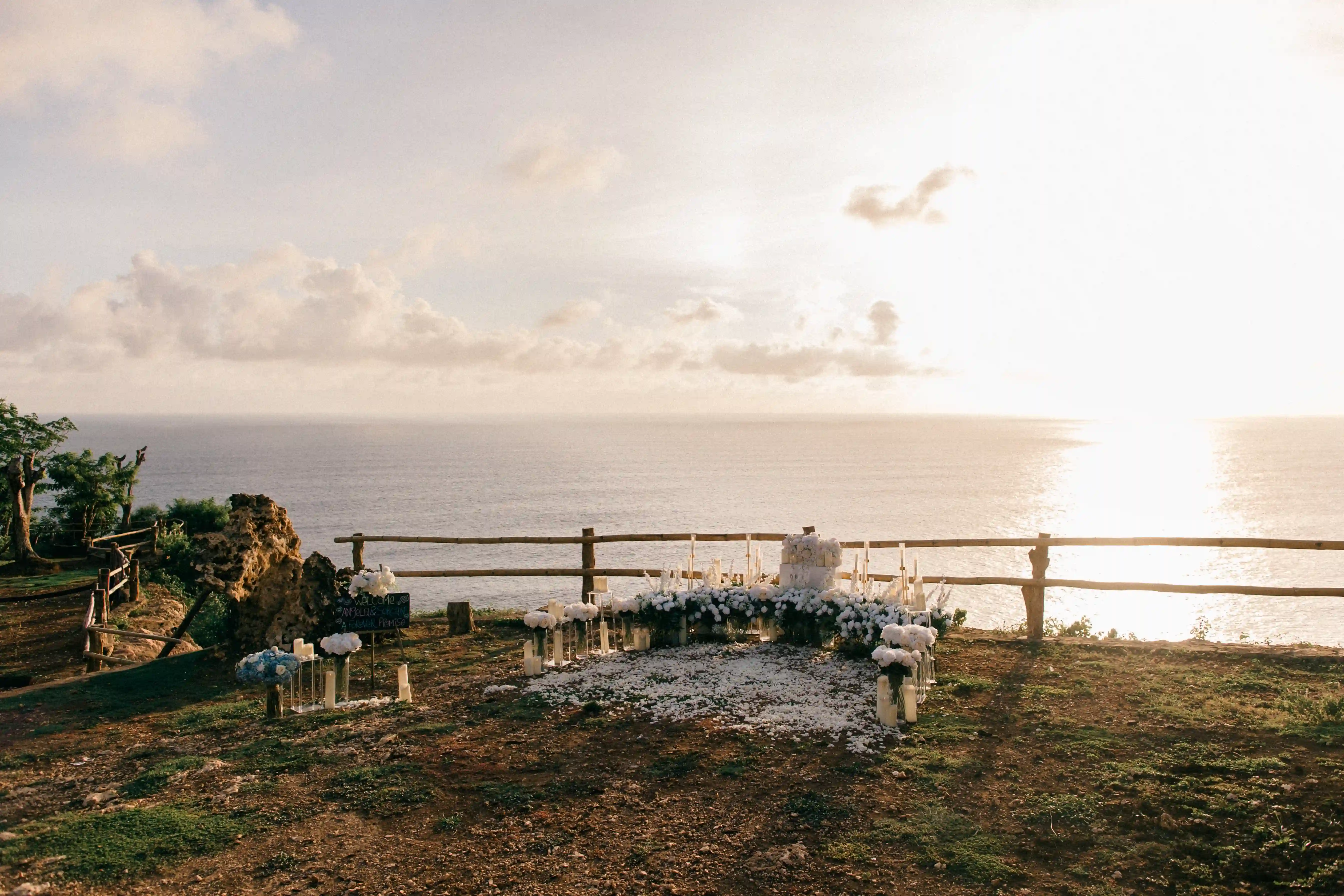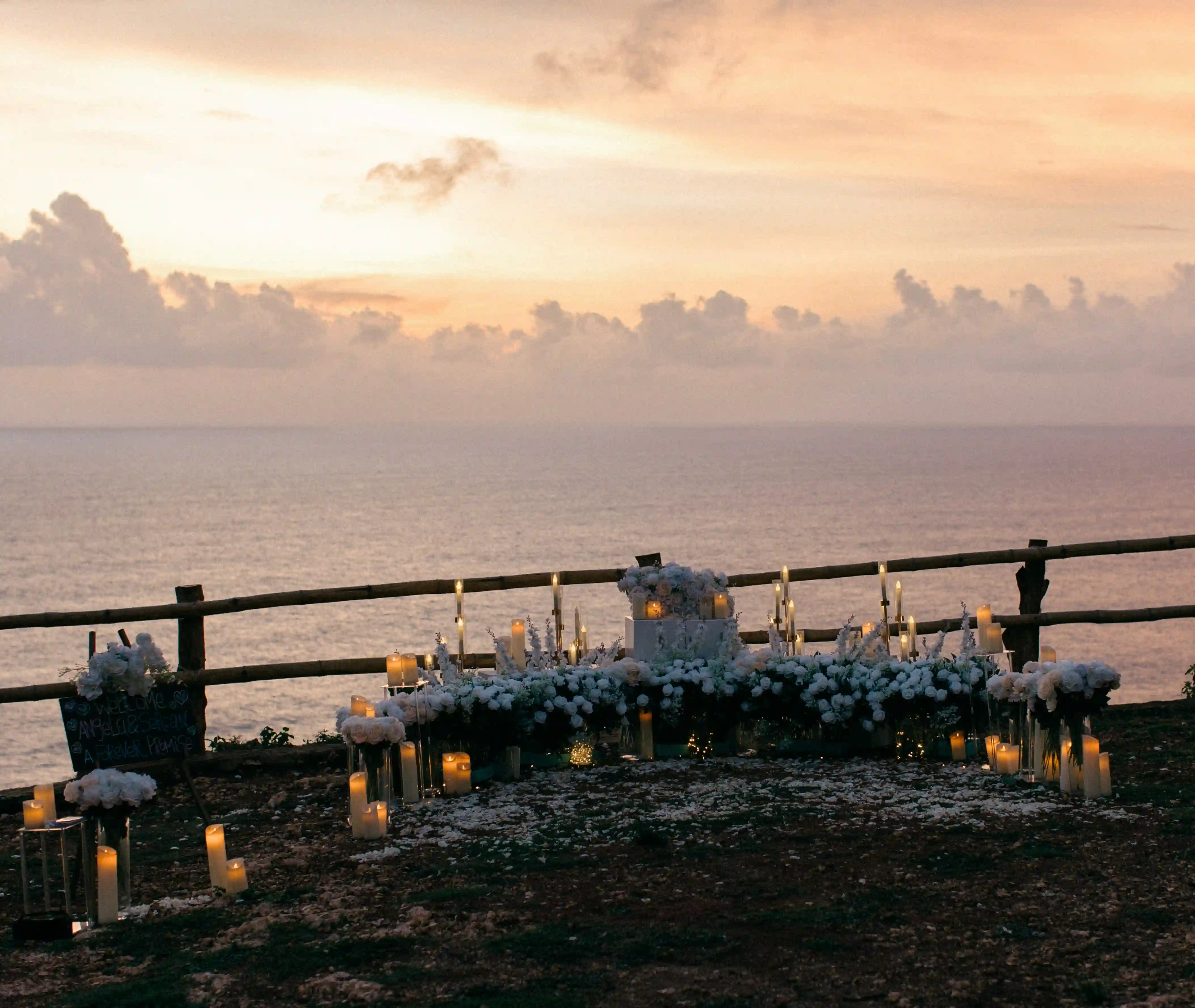 On the edge of the cliff, we designed a minimal yet striking layout: white and blue flowers, candlelight, and clear glass stands blending softly into the landscape. Nothing dramatic. Just an elegant frame that kept the focus on the two of them and the endless view behind them.