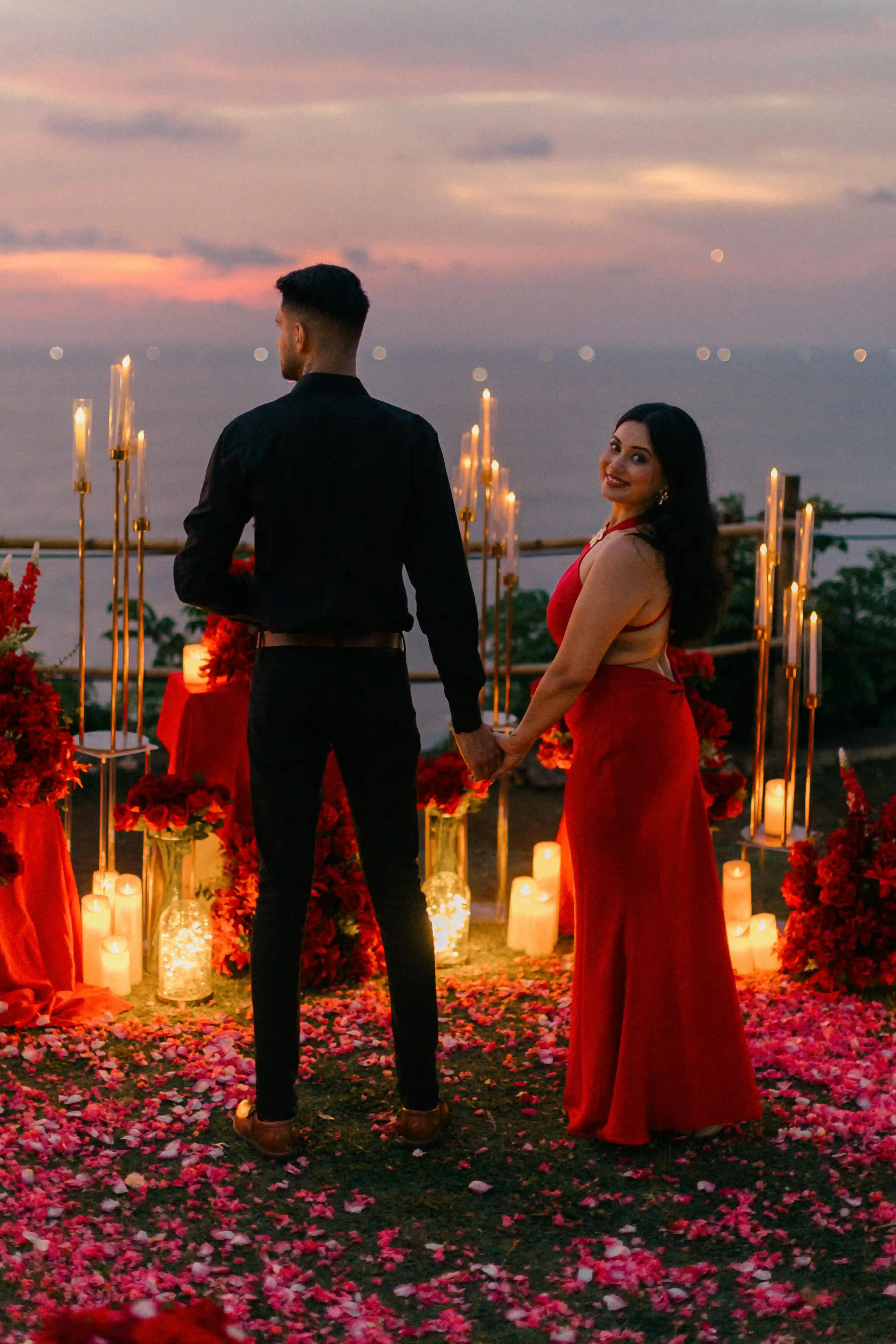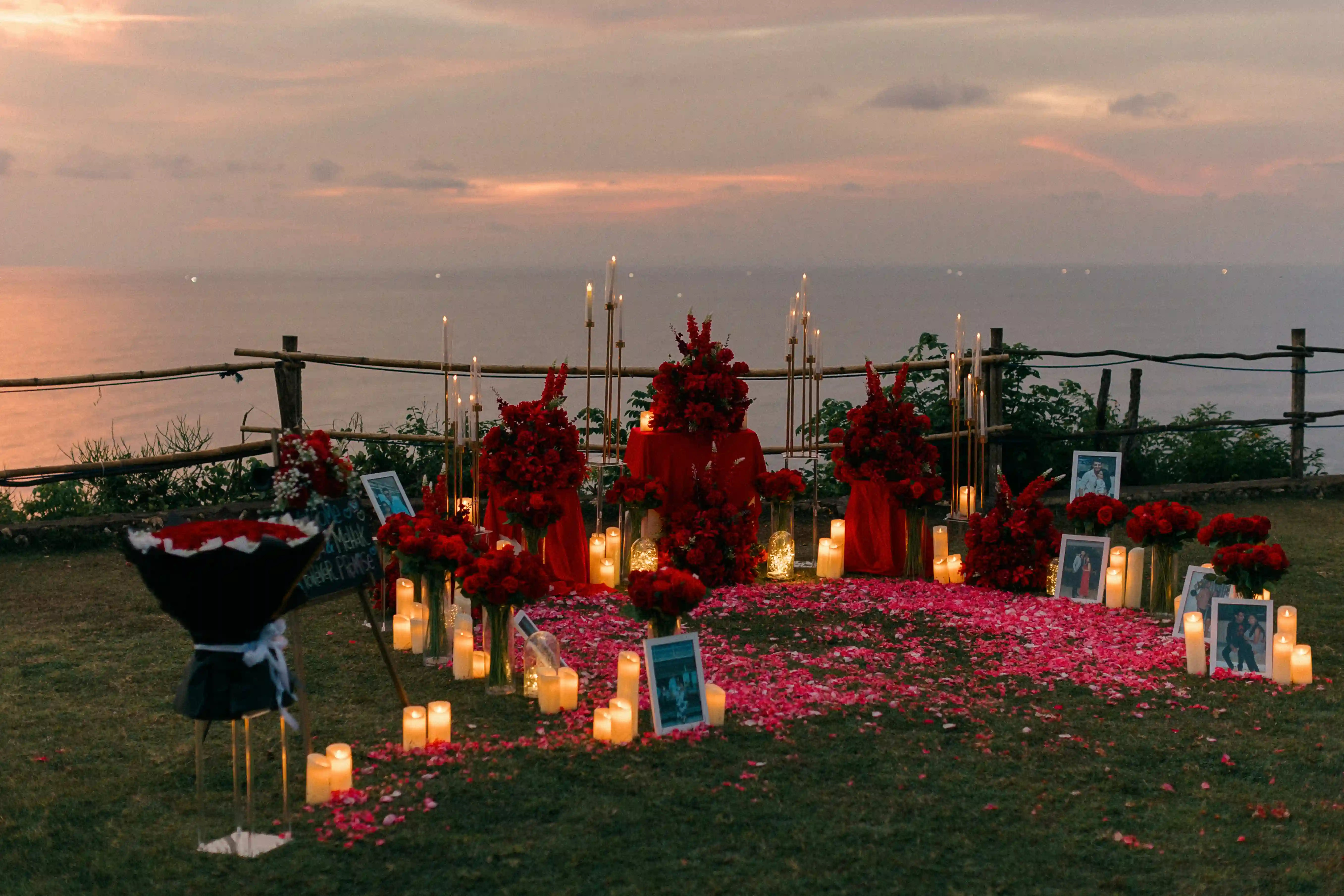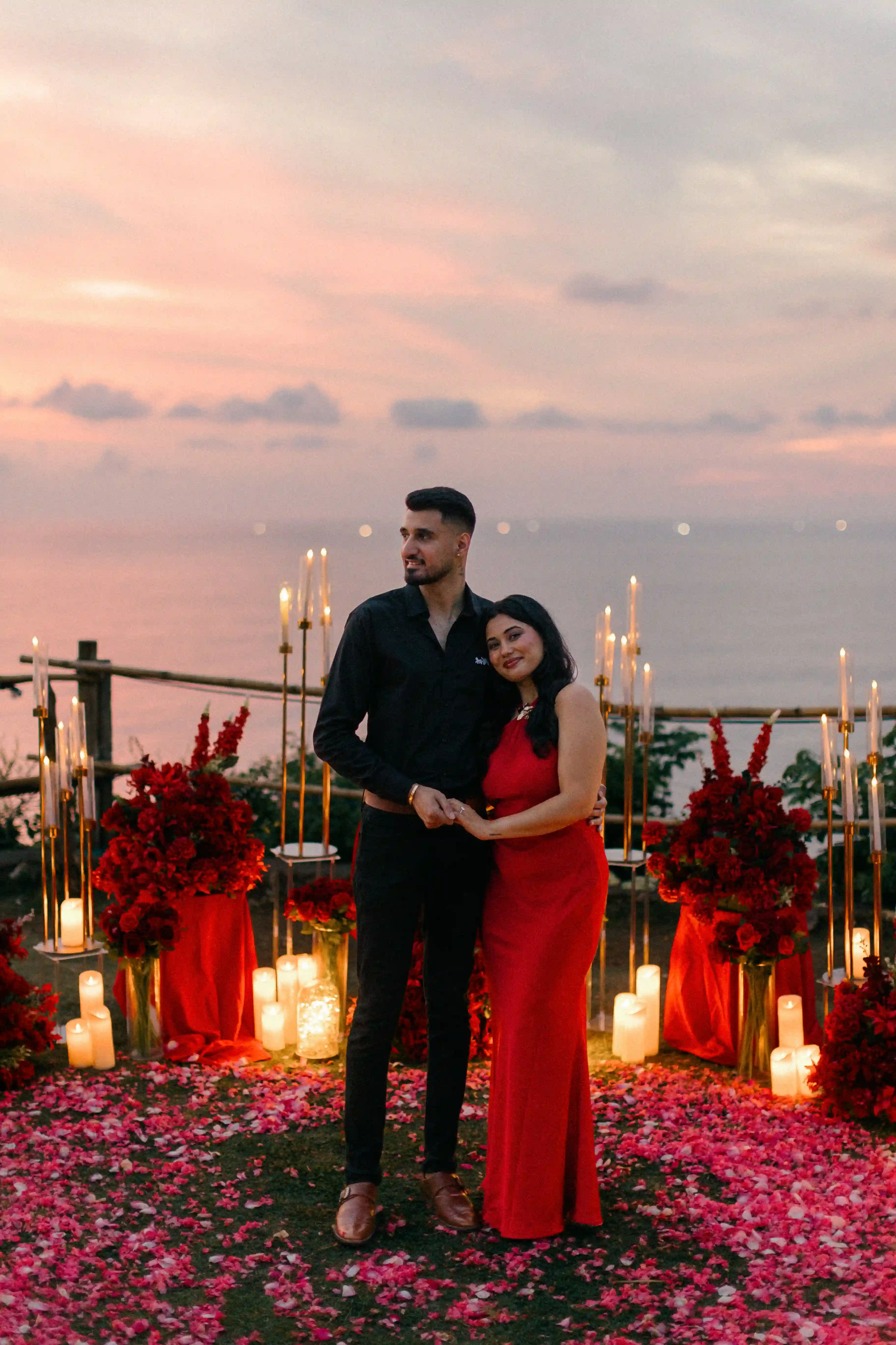 He wanted a proposal that felt timeless and passionate, built entirely around the color red. Roses, candles, velvet and sunset light blending together on the cliffs of Uluwatu. Every detail was designed to reflect their story — bold, warm and deeply romantic.