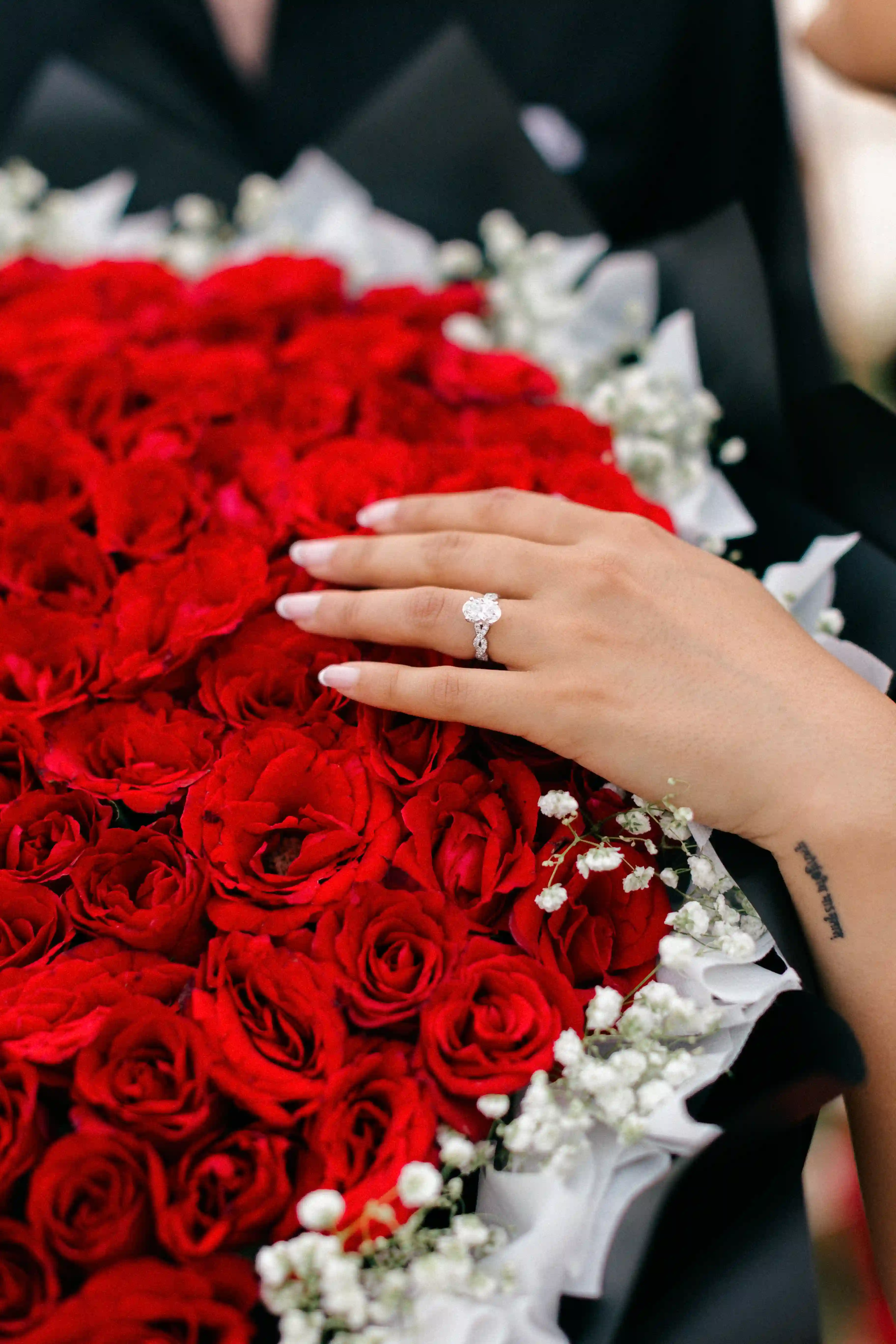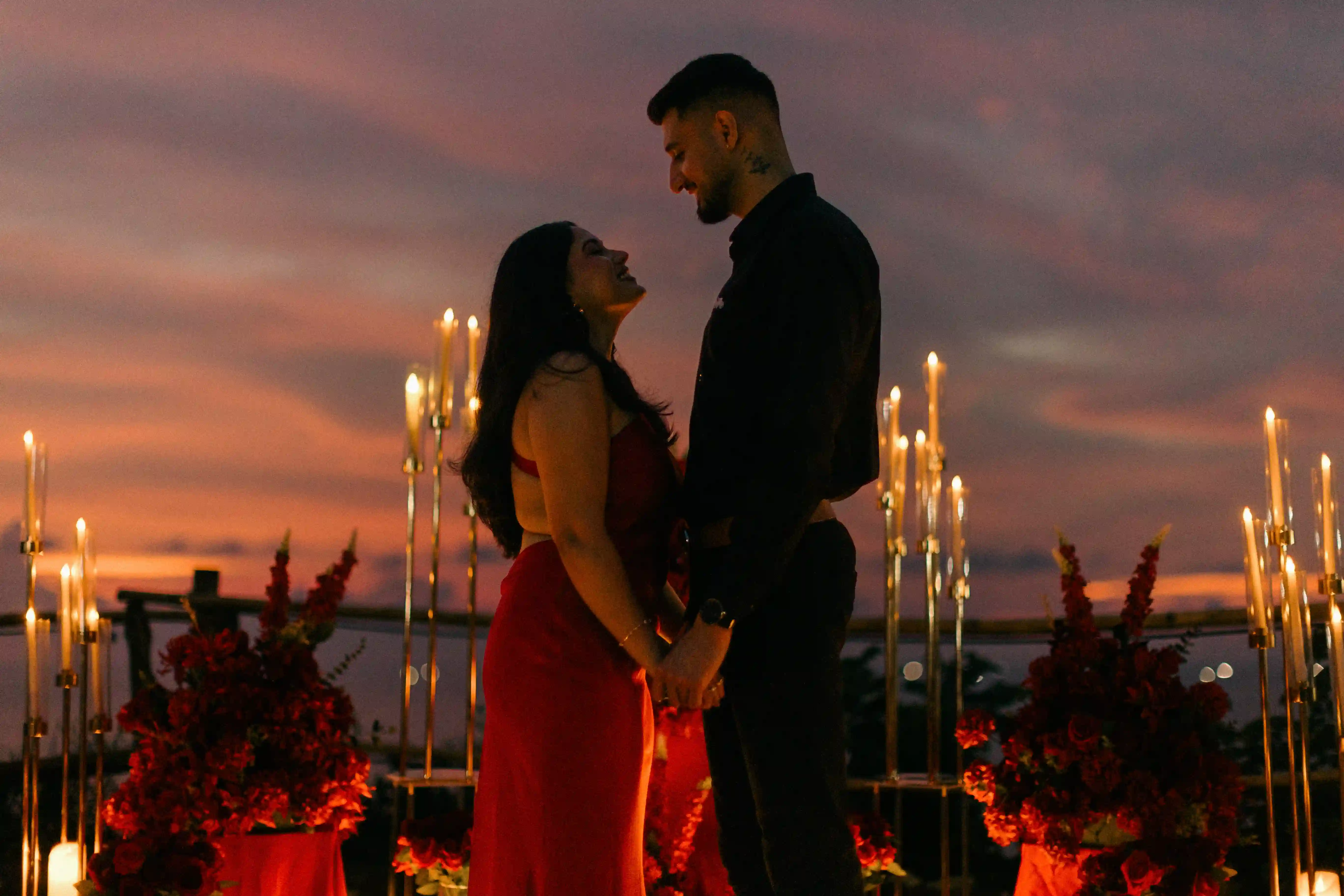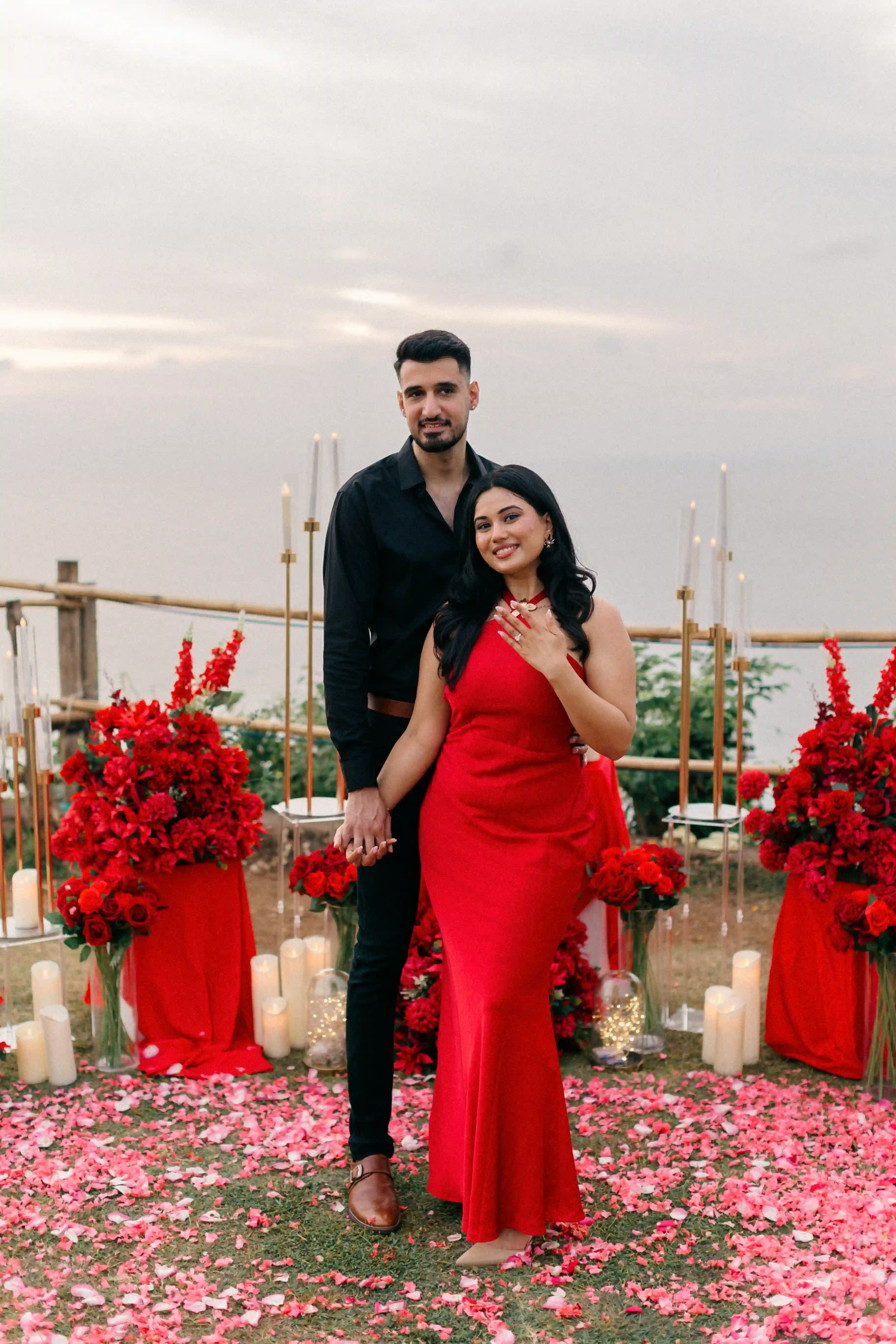 He wanted a proposal that felt timeless and passionate, built entirely around the color red. Roses, candles, velvet and sunset light blending together on the cliffs of Uluwatu. Every detail was designed to reflect their story — bold, warm and deeply romantic.