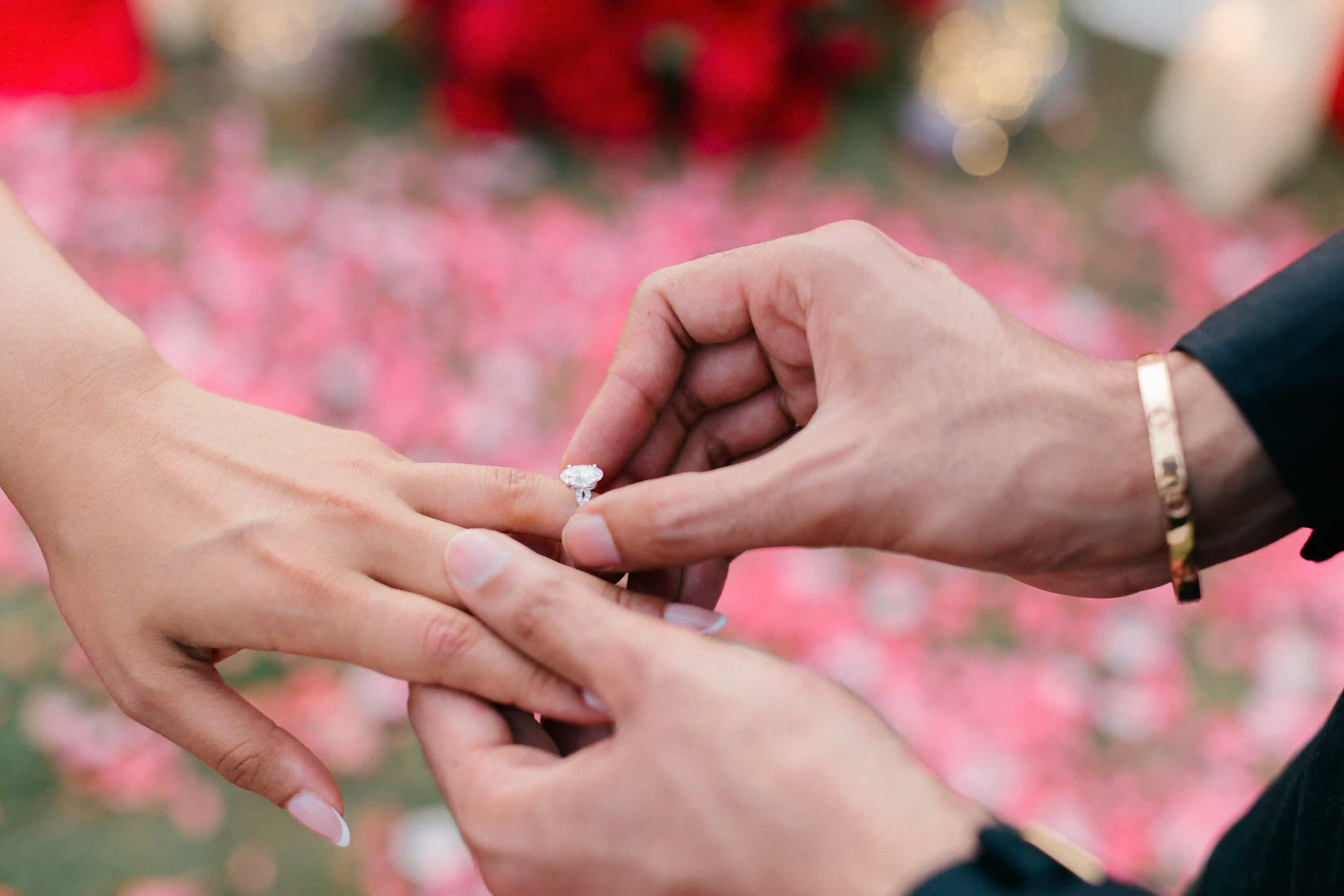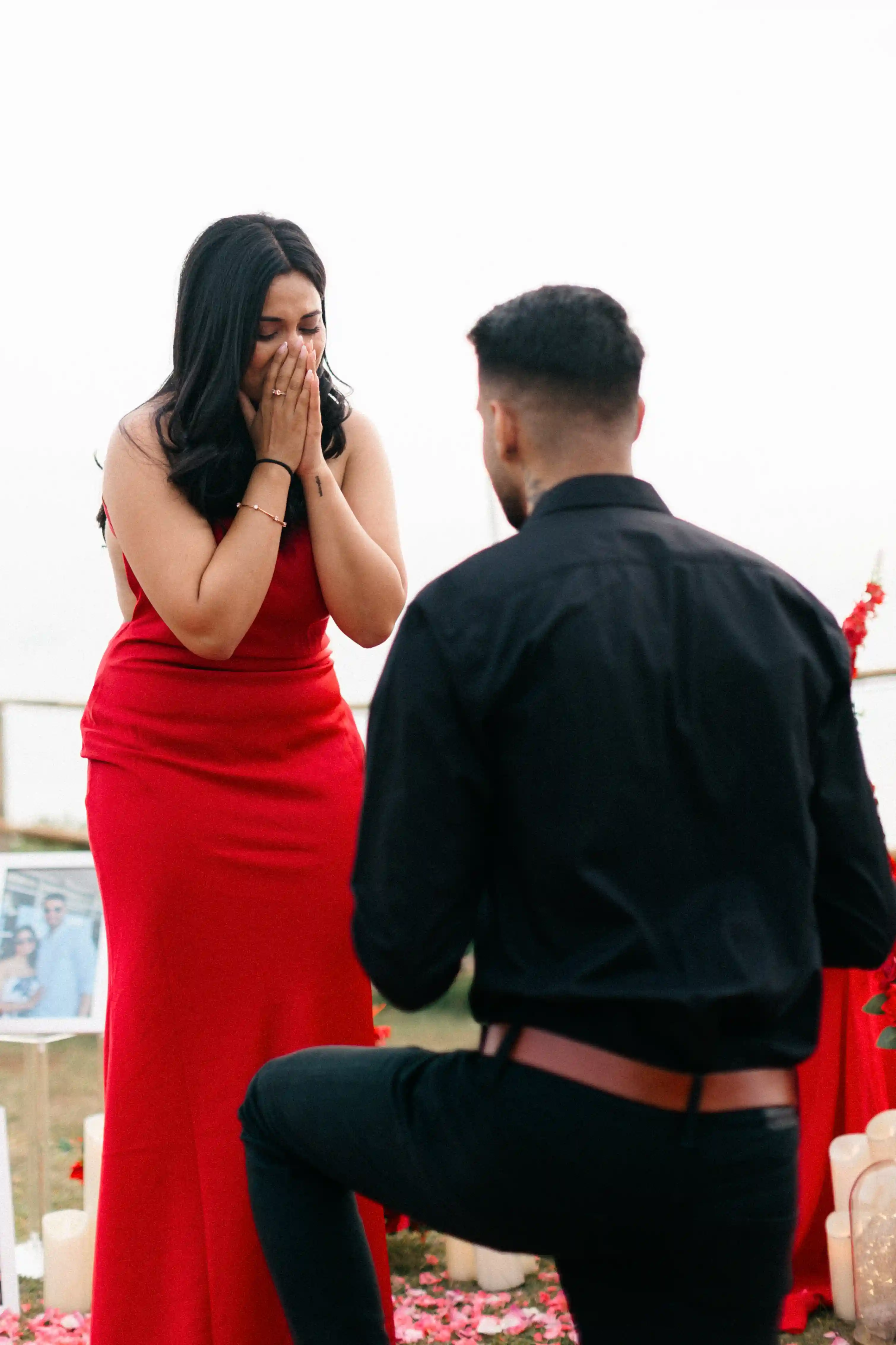 As Mehak arrived, she thought it was just a photoshoot before dinner. Then she noticed the pictures of them placed between the flowers, realized what was happening, and turned to see Chaintanya waiting for her. With the ocean behind them and the sky glowing in soft pink and gold, he took her hands and asked her to marry him.