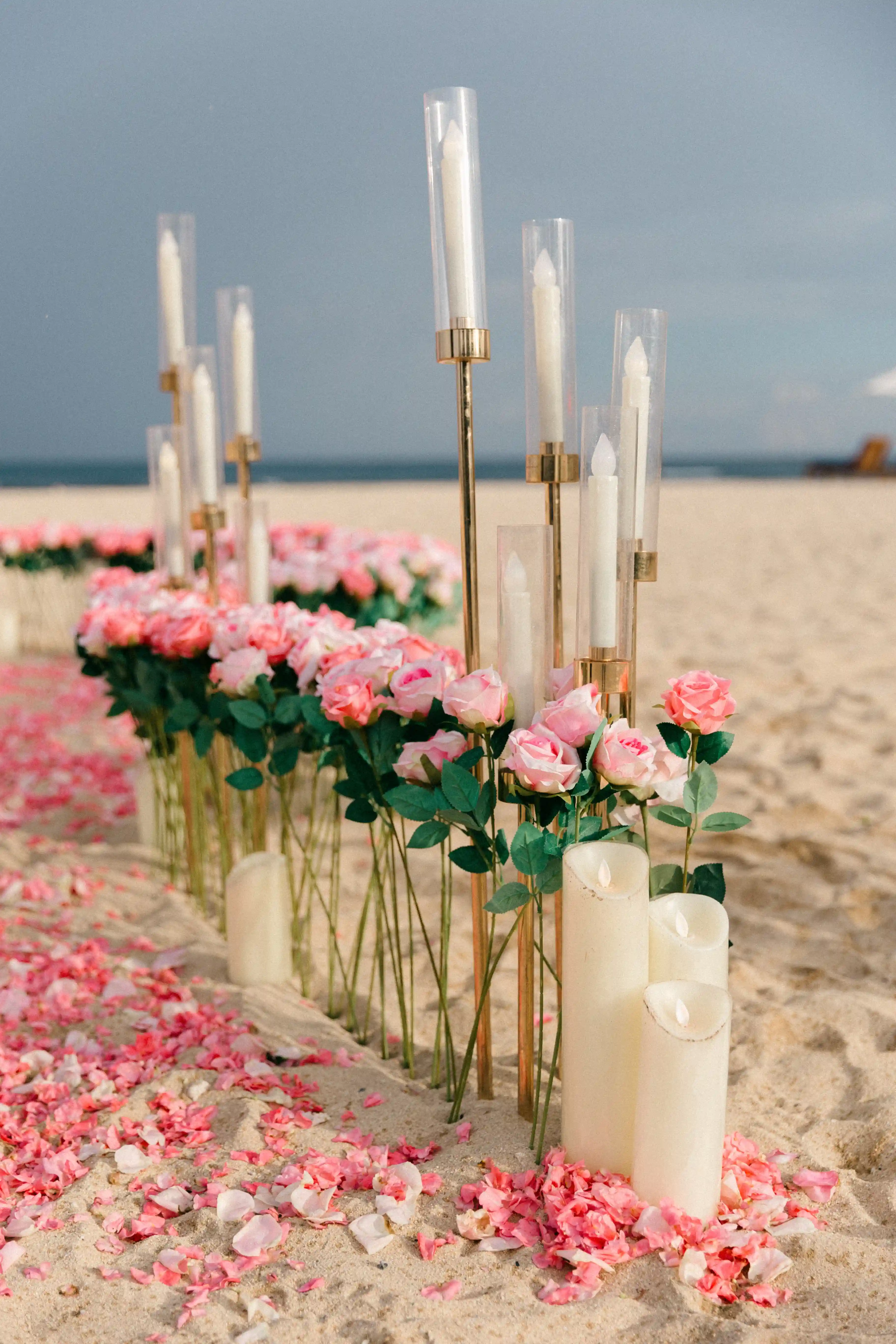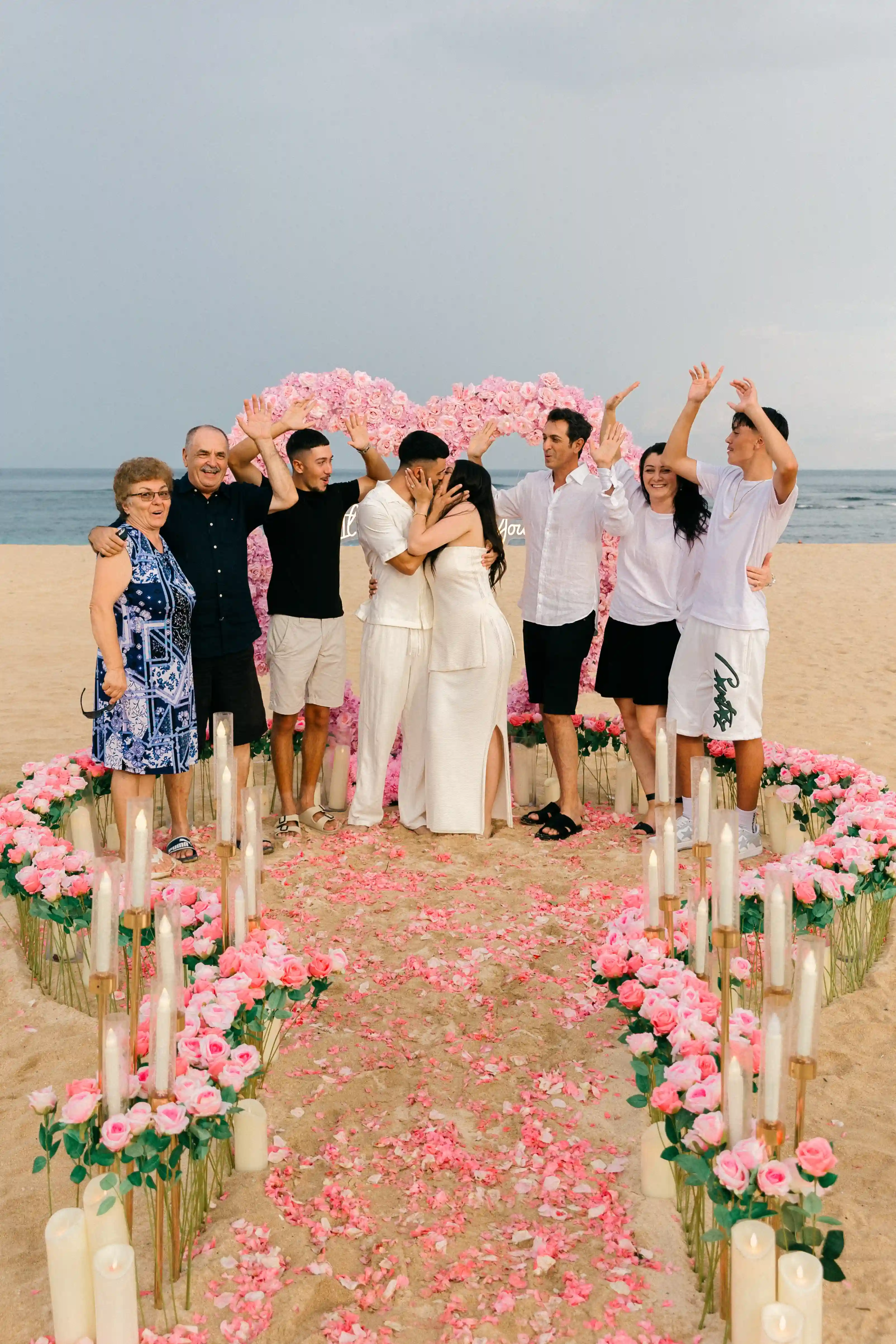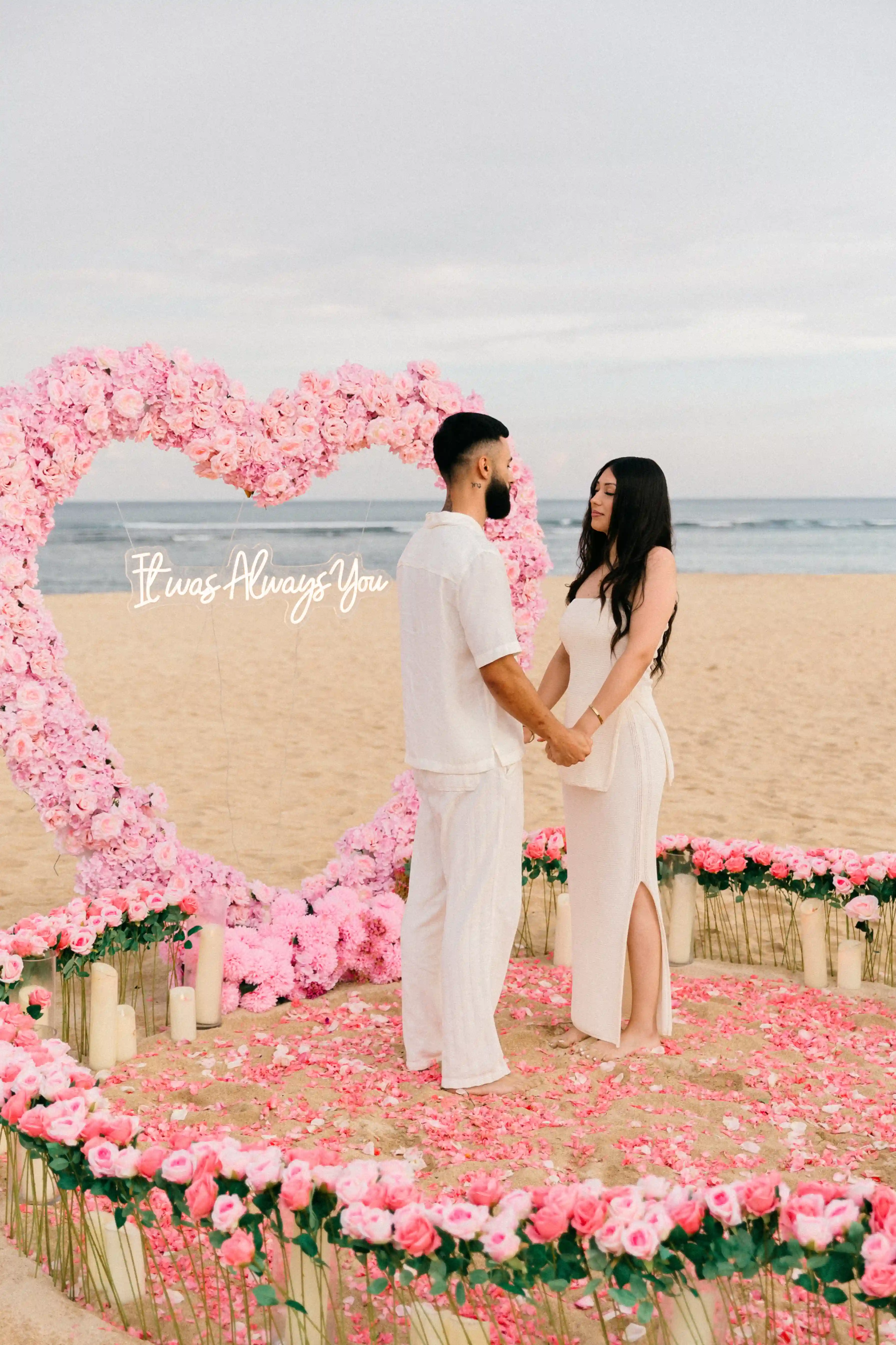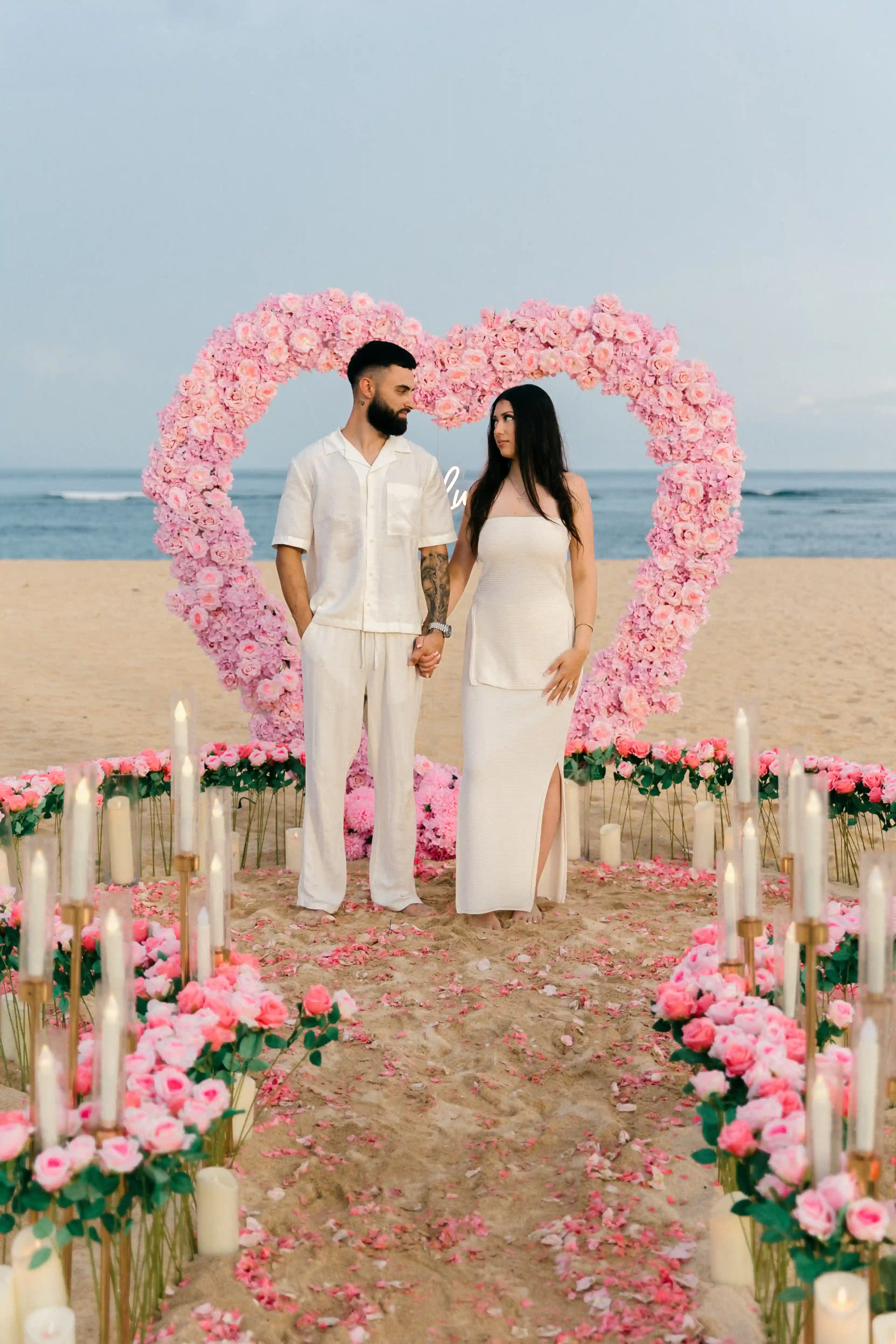 On a secluded beach with endless ocean views, we designed a floral heart arch in gentle shades of blush and soft pink. A symbol of love that had always been there—waiting. The heart framed the horizon, blending seamlessly with the sand and sea, creating a sense of infinity and connection.