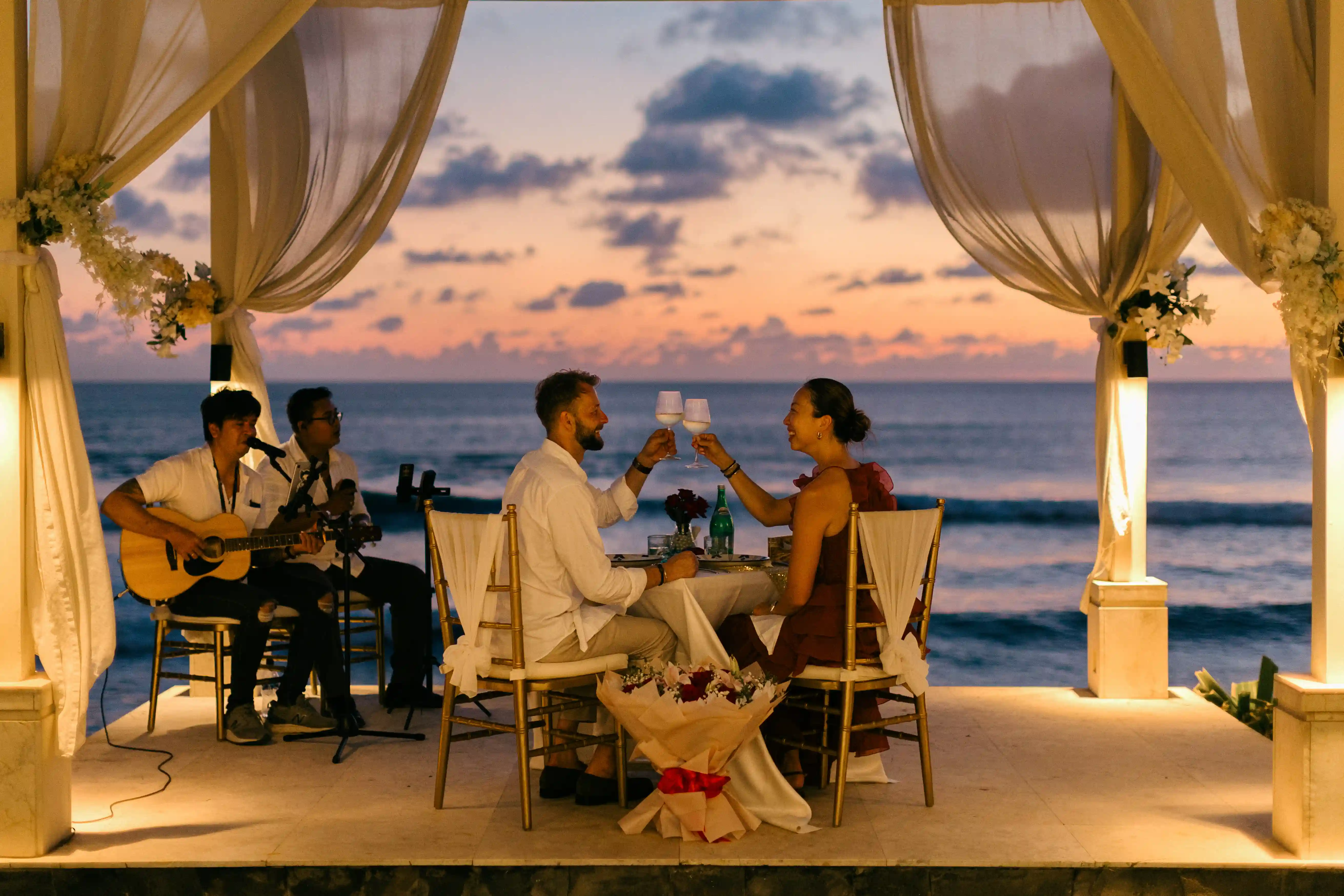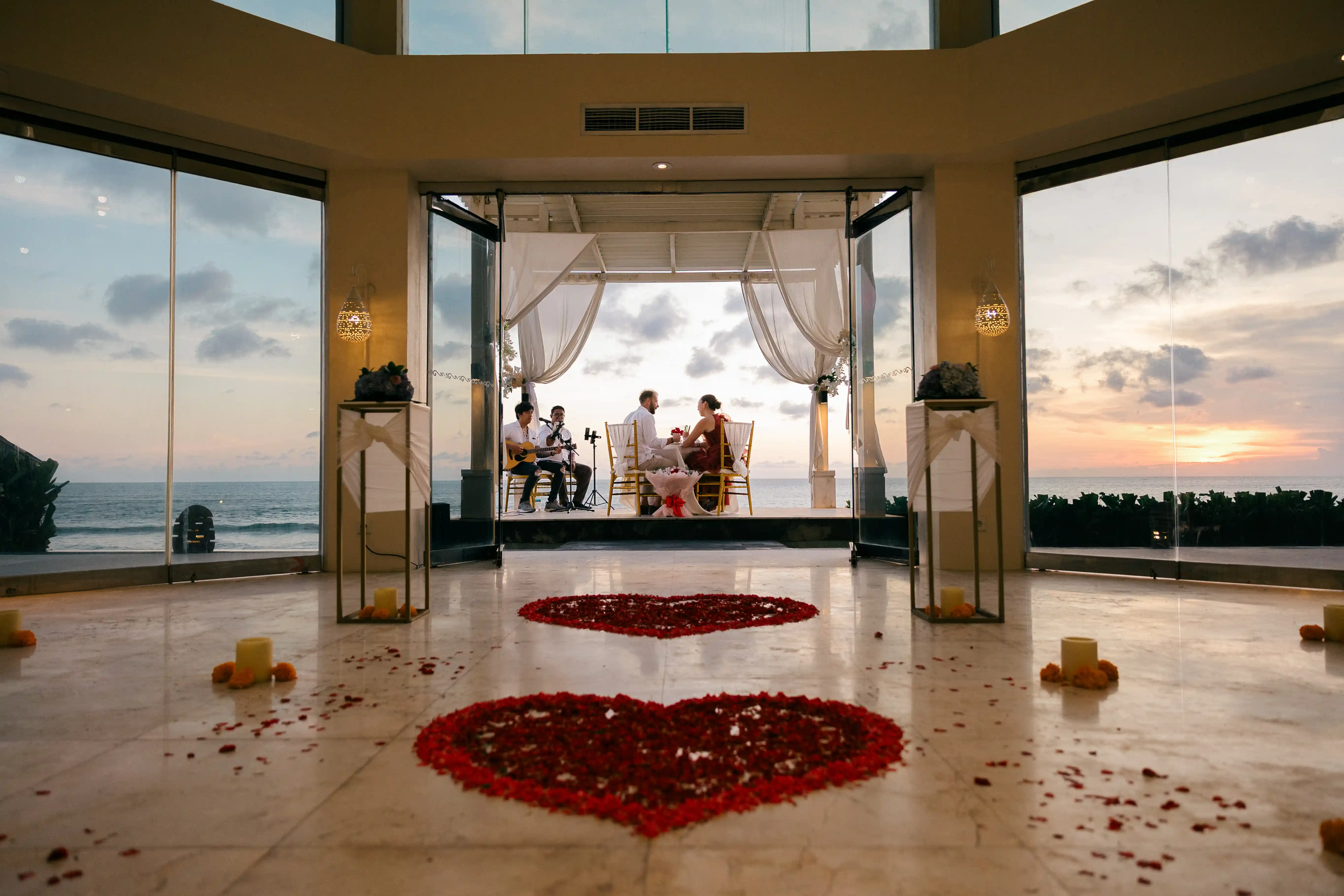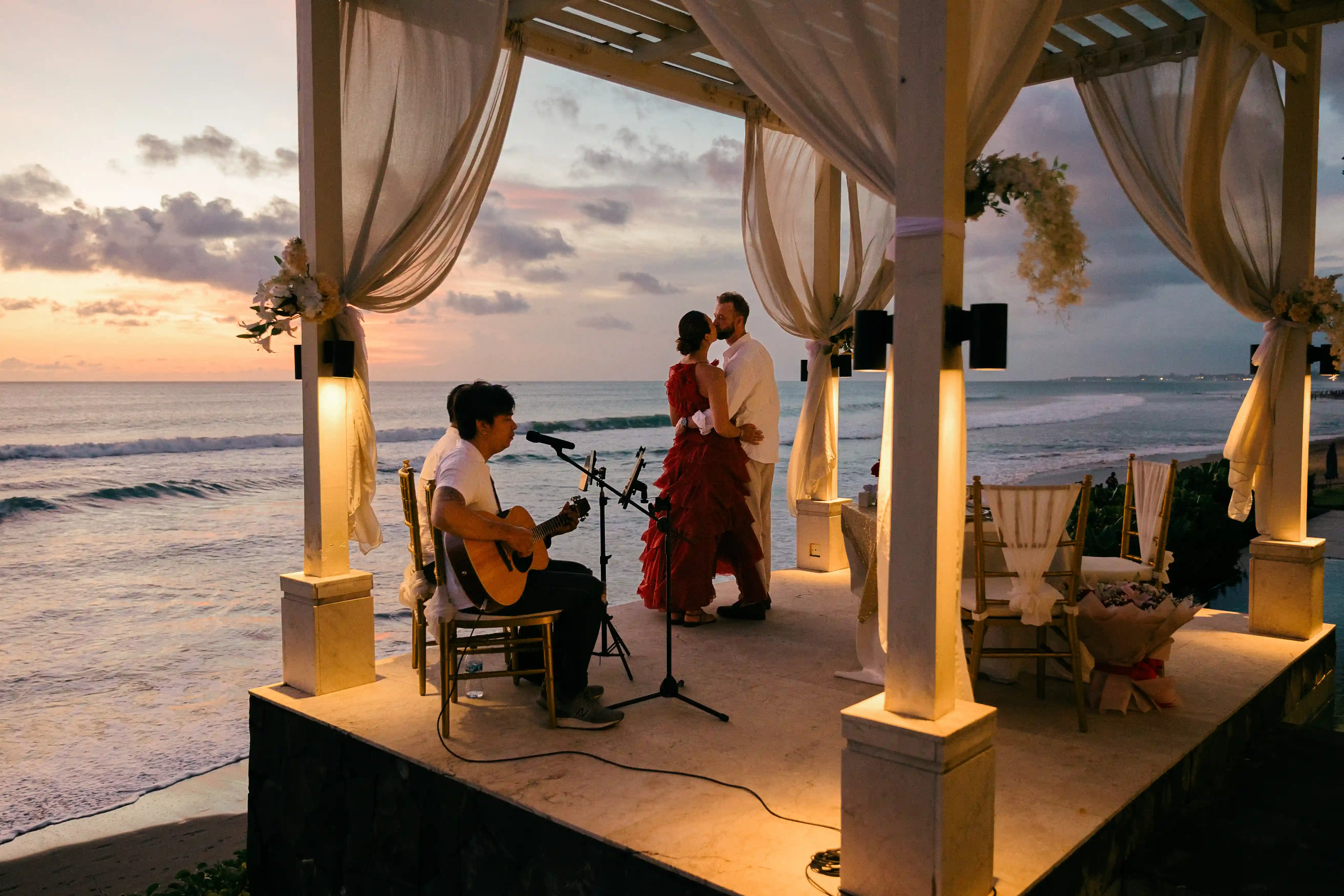 As the sun began to set over the ocean, live music played in the background, creating a magical and emotional atmosphere. The combination of golden light, gentle waves, and music made the setting feel truly special and one of a kind.