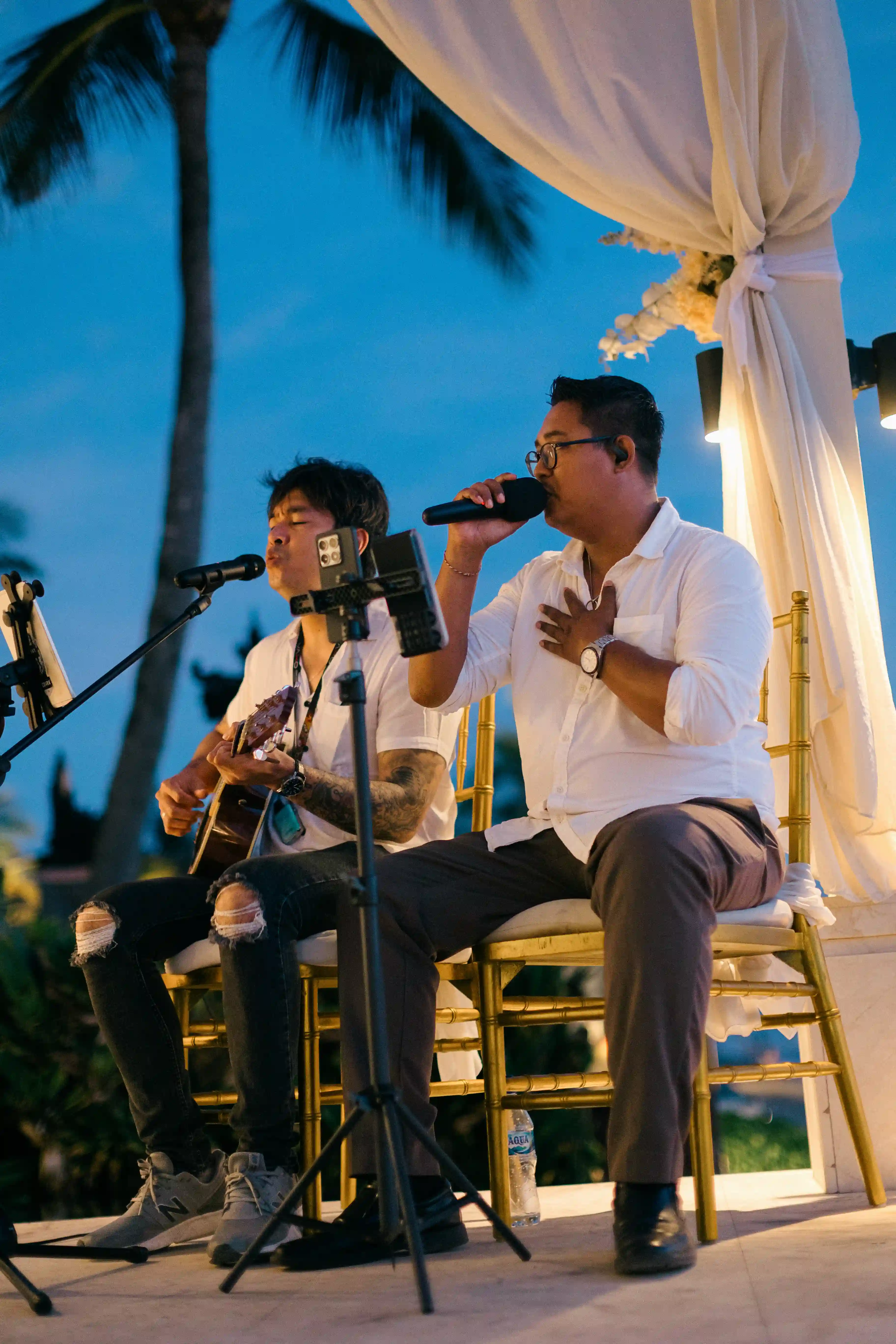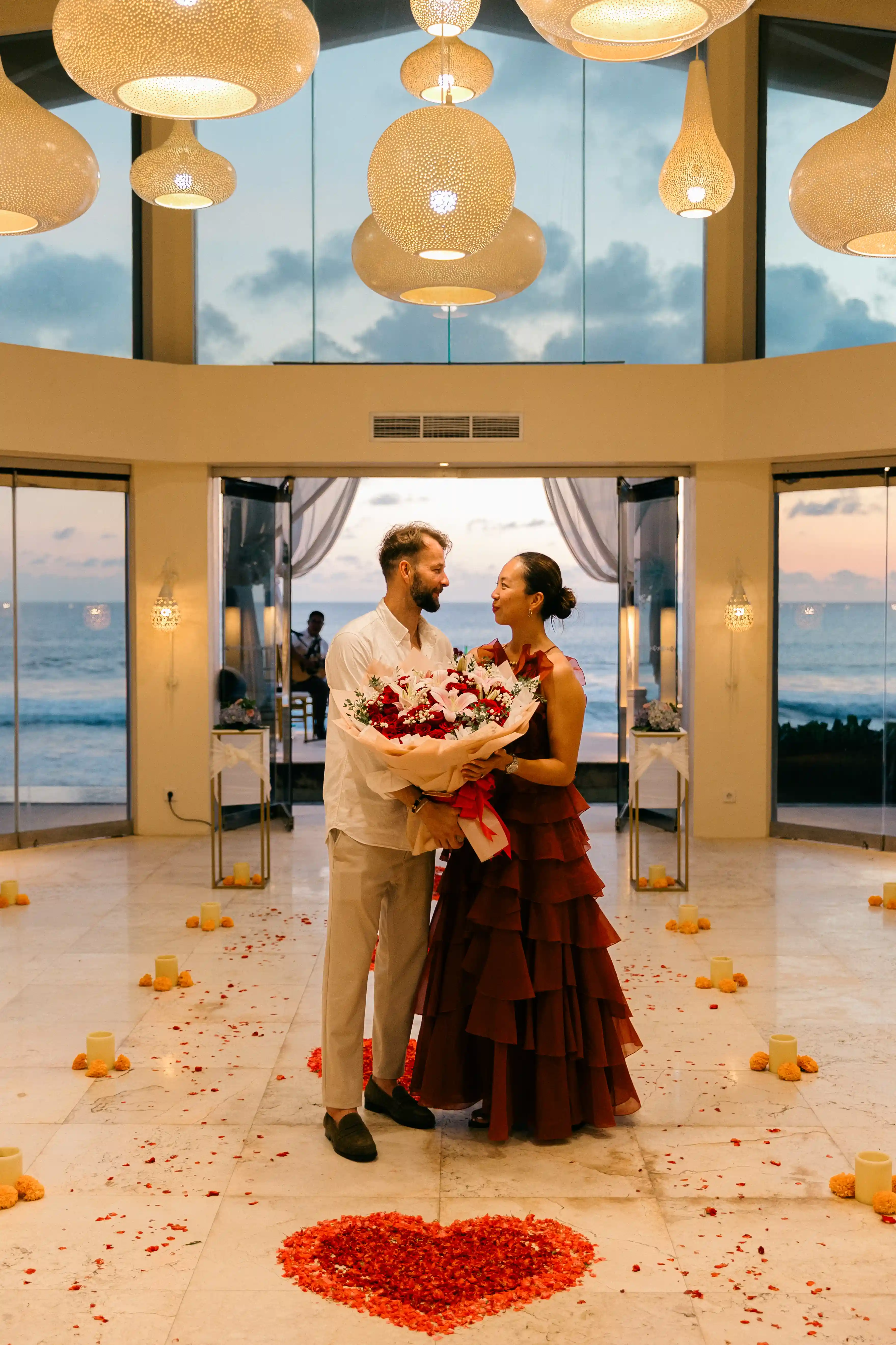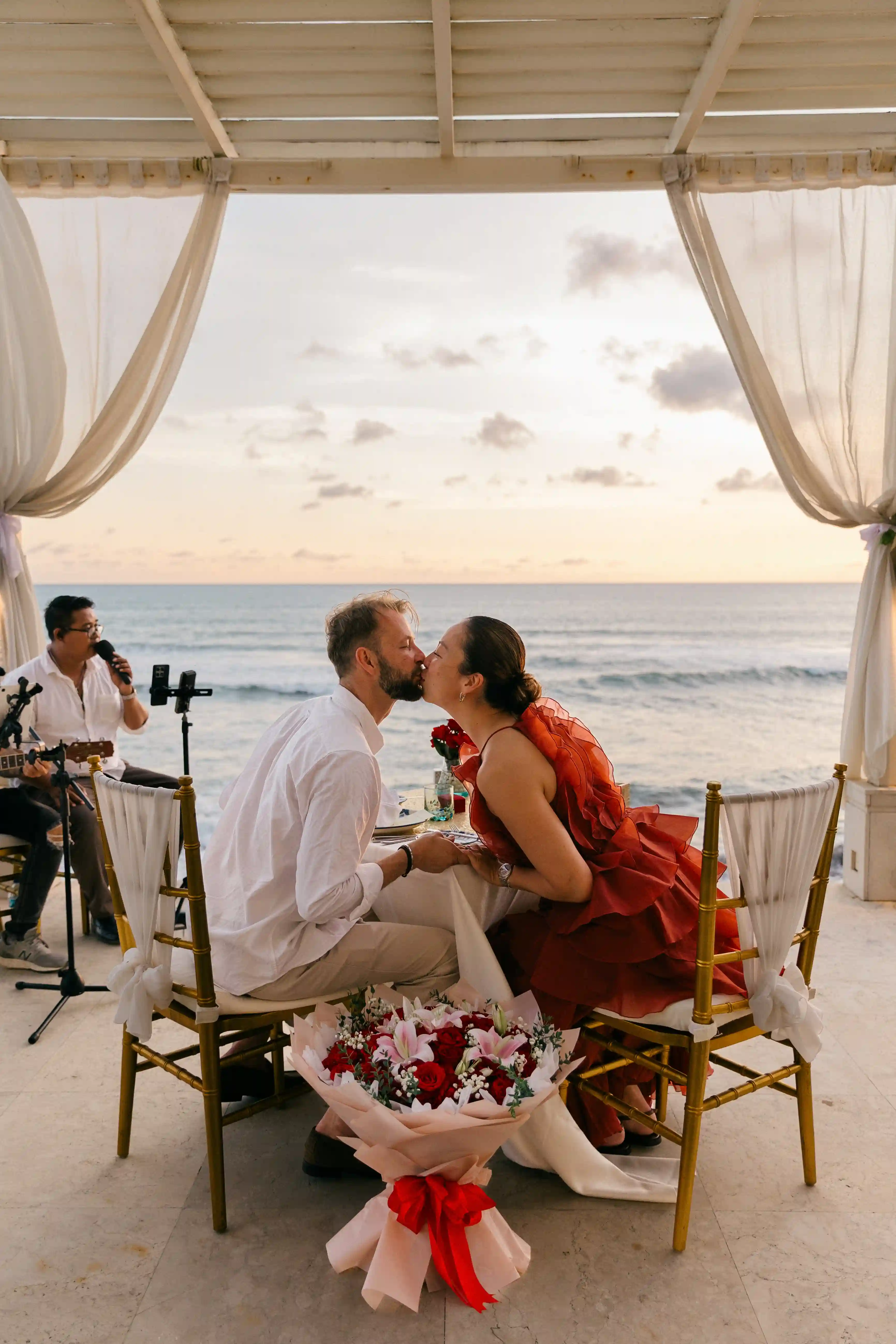As the sun began to set over the ocean, live music played in the background, creating a magical and emotional atmosphere. The combination of golden light, gentle waves, and music made the setting feel truly special and one of a kind.
