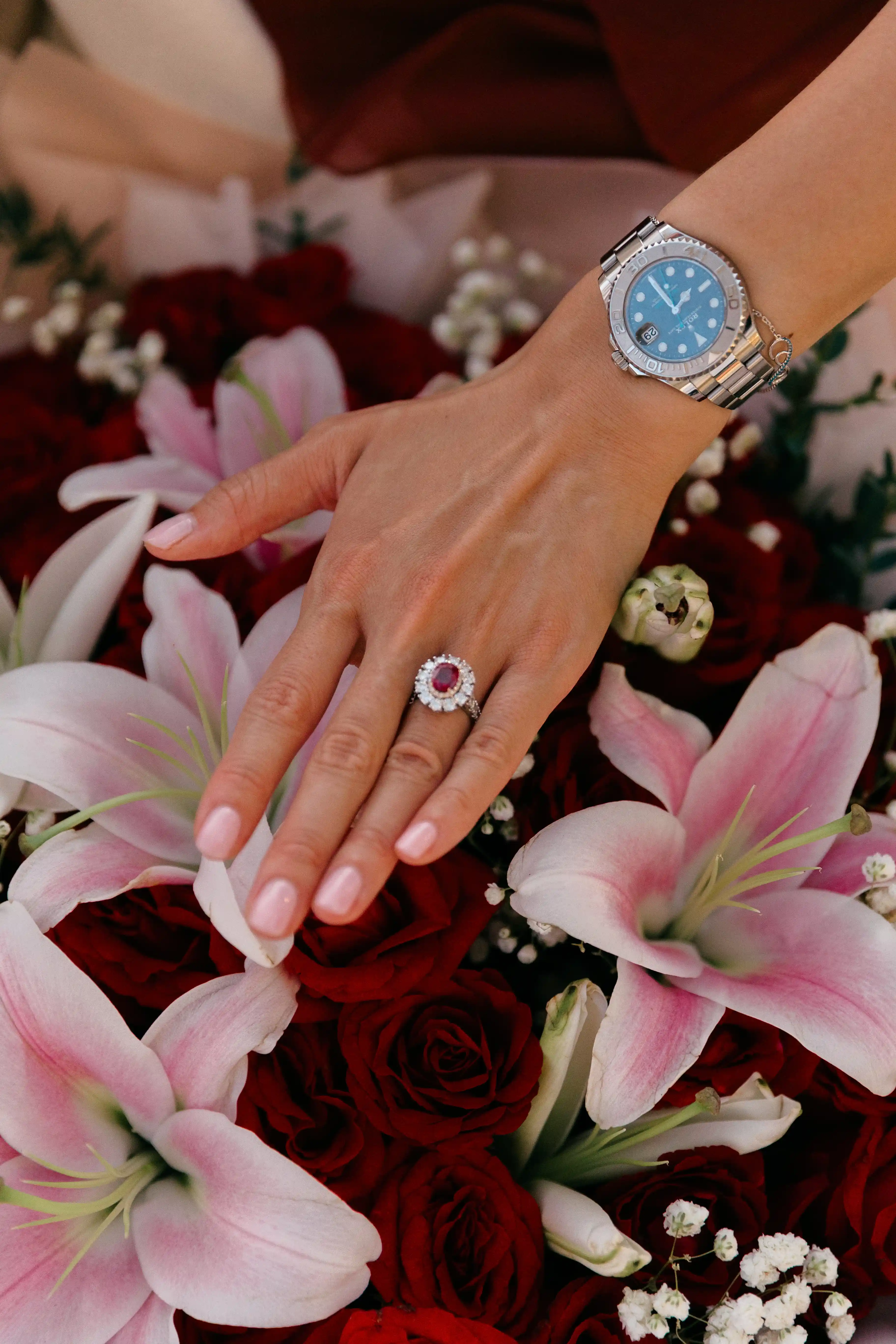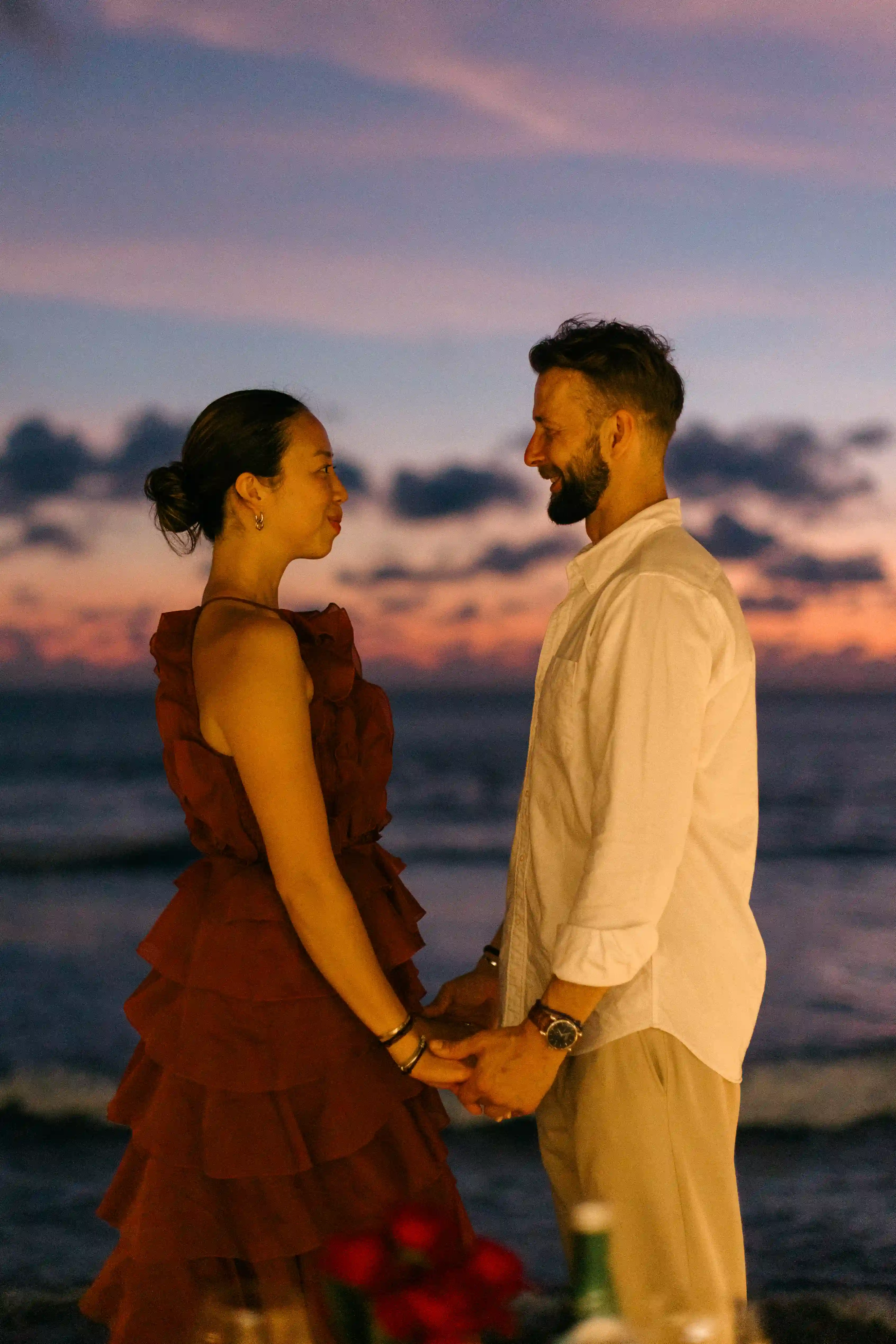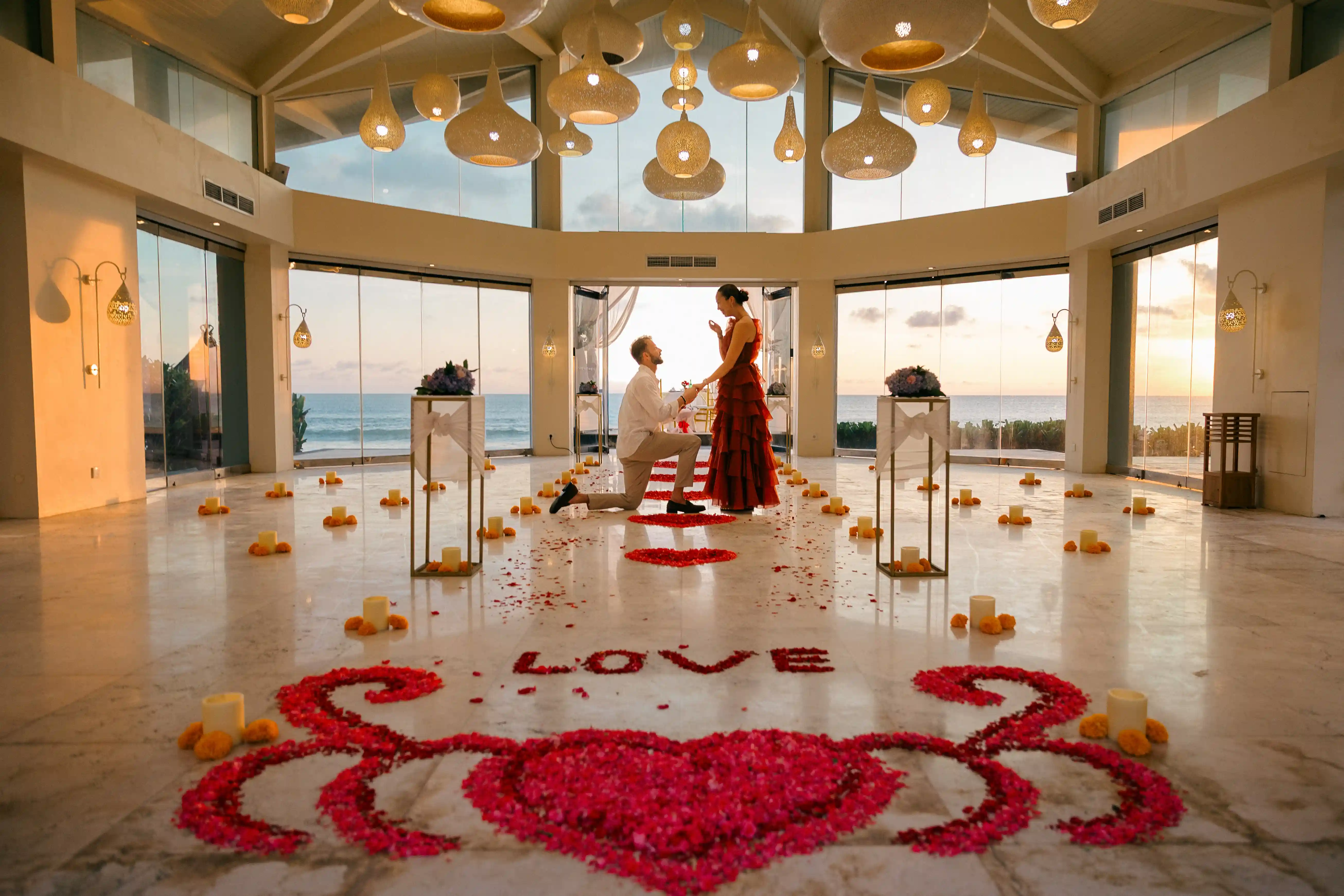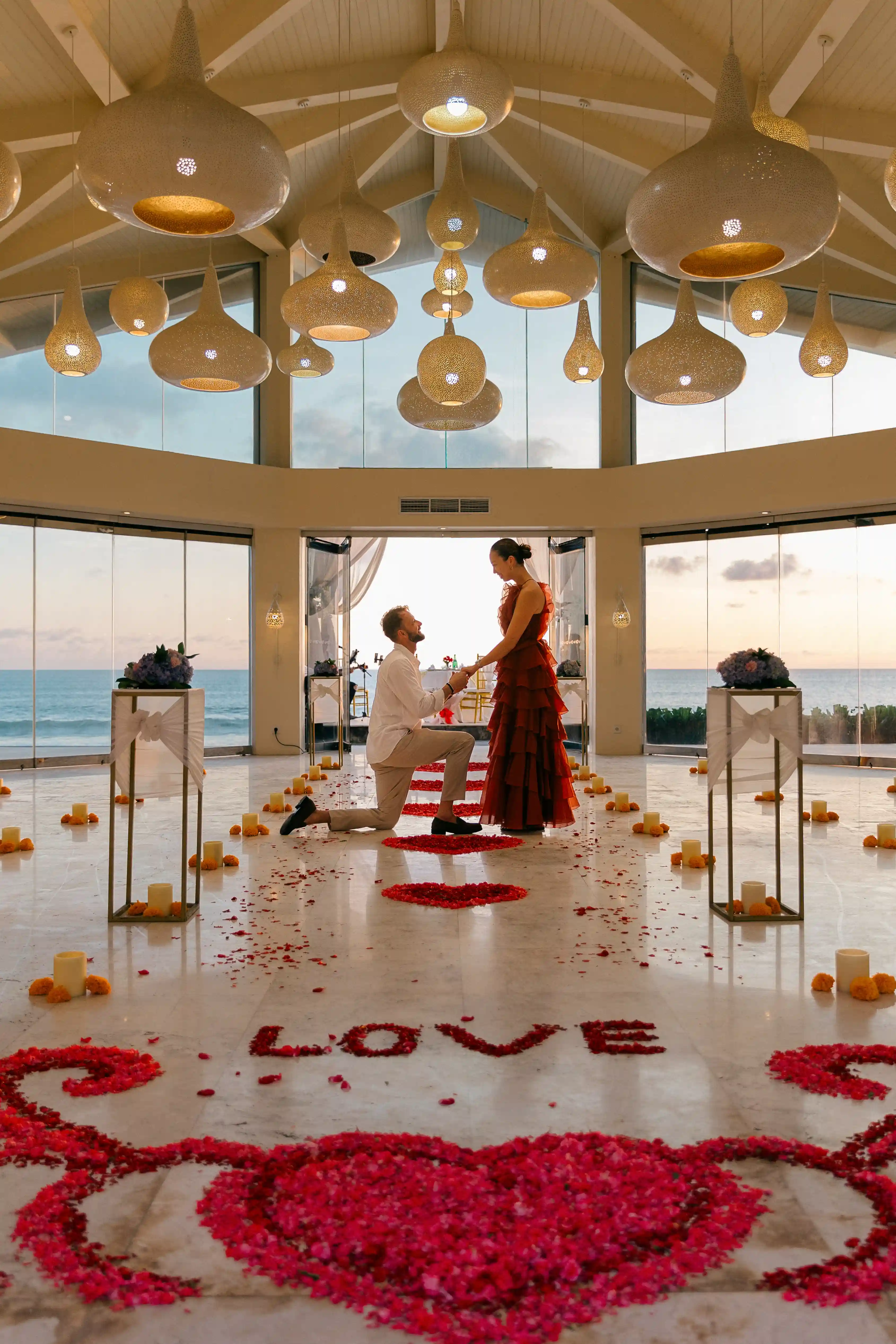 Maria believed they were simply heading to a romantic sunset dinner. Little did she know, the day she has been waiting for so long has come. As they walked along the rose petal pathway and arrived at the private oceanfront setup, she was already captivated by the view and the atmosphere. In that perfect moment, with the sun setting behind them and music softly playing, Andre asked the question.
