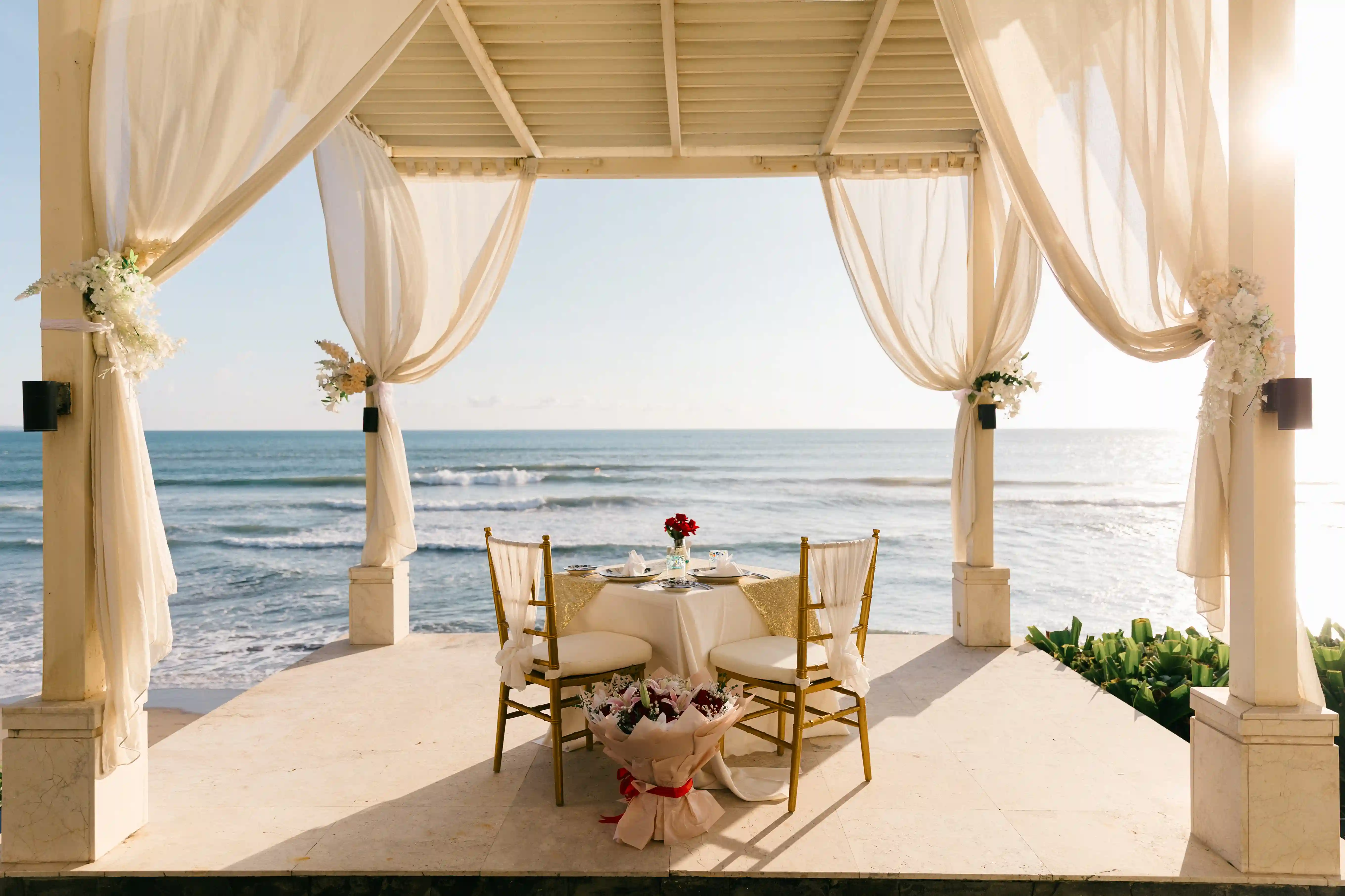 We designed a stunning private dinner setup right by the ocean in Seminyak. A romantic pathway lined with rose petals guided the couple into the beautifully styled space. The table was elegantly set, surrounded by soft candlelight and carefully curated details that enhanced the natural beauty of the location.