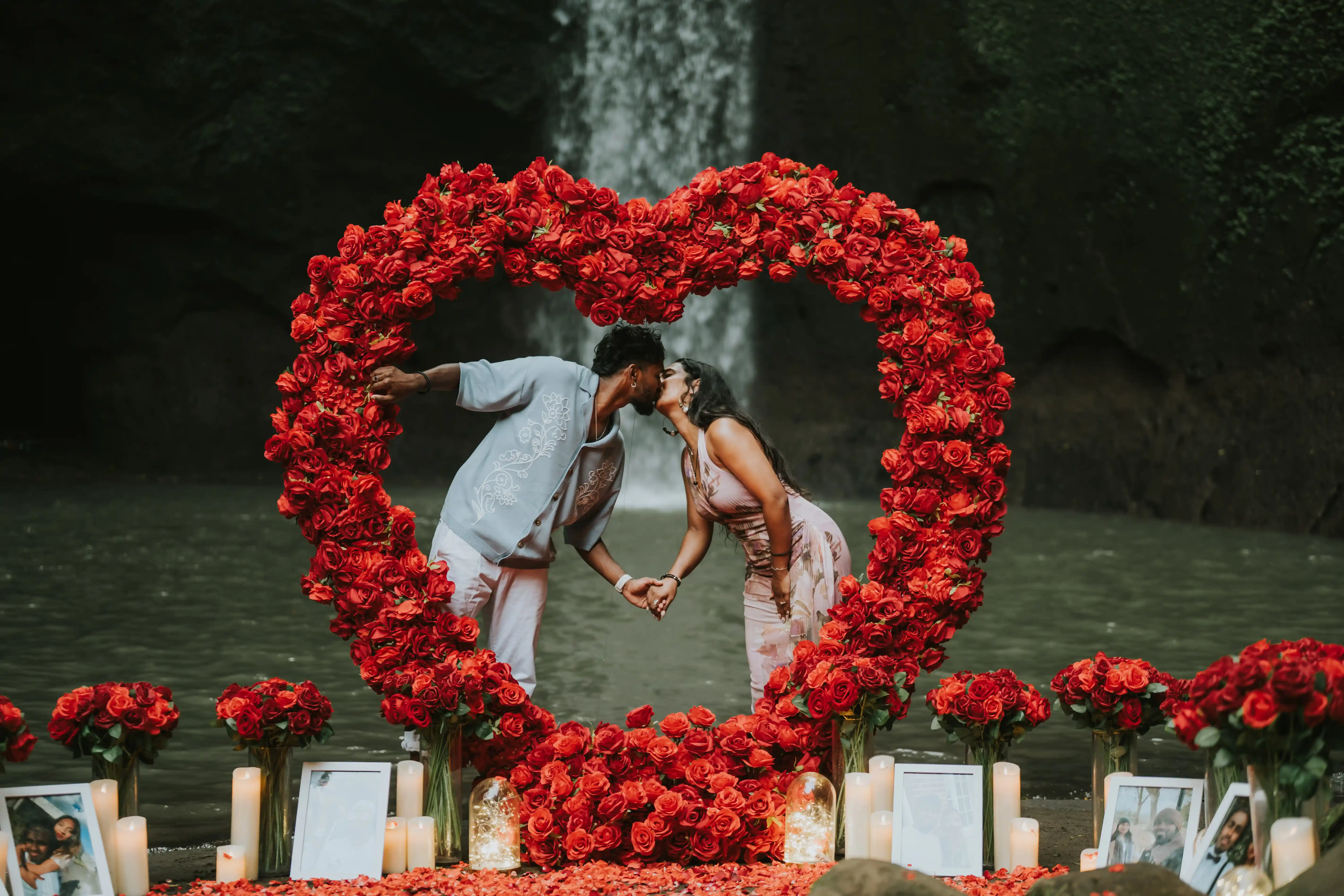 At the foot of a roaring waterfall, we built a romantic scene anchored by a heart of red roses. Around it, candles flickered alongside framed photos capturing Jeremy and Myrha’s love story, making the setup feel intimate despite the grandeur of the location. The rose petals and glowing details blended seamlessly into the natural beauty of the falls.